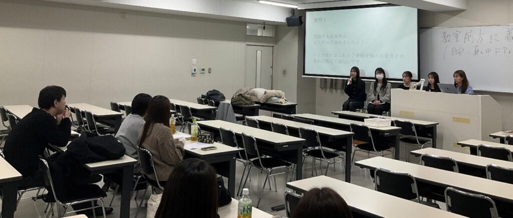 秋学期の初回として開講した対策講座では、学科の先生から教採対策の心得や勉強の仕方についての講義を受けた後、4年生で現役合格を果たした先輩たちによるトーク会を行いました。